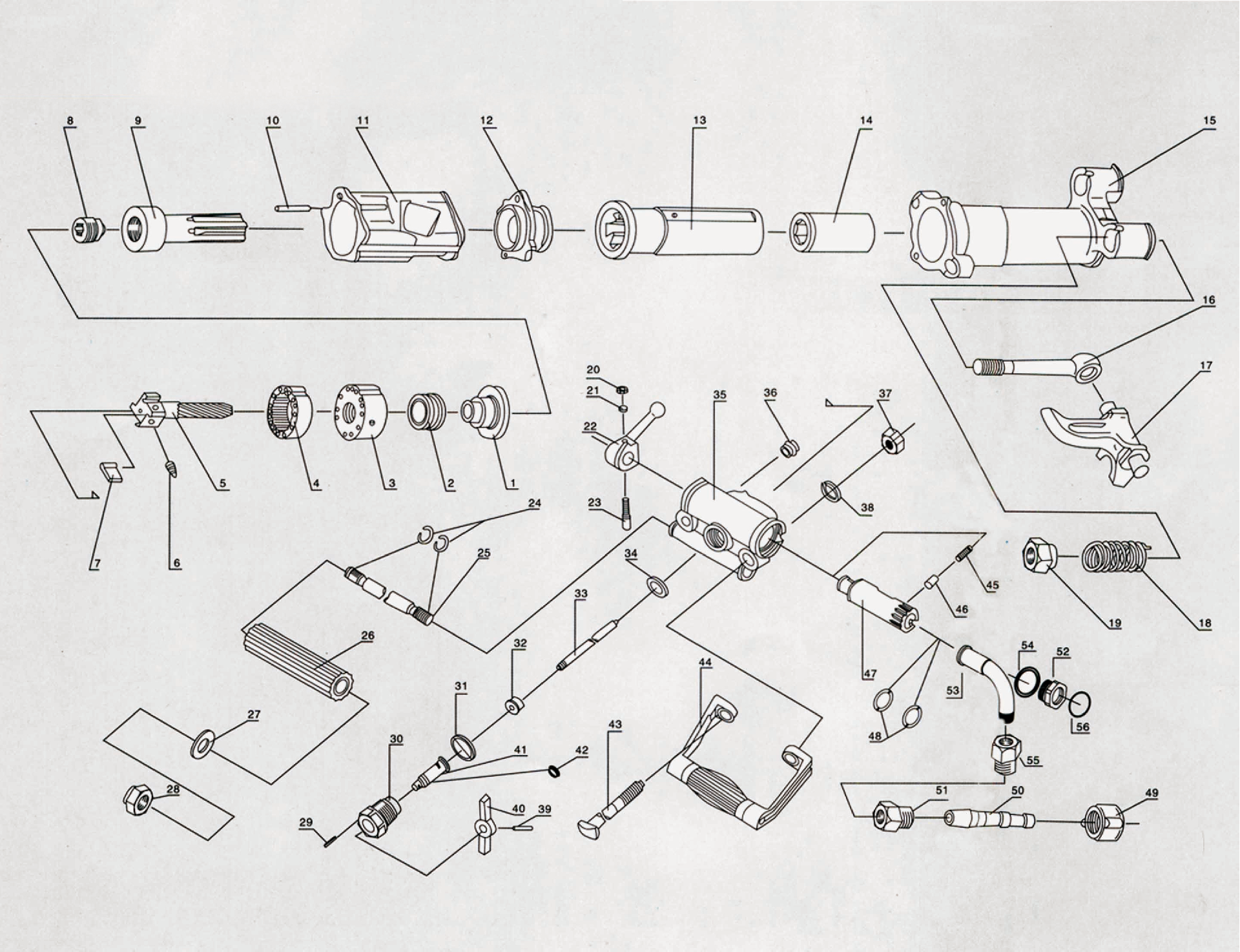 Y20型手持式鑿巖機是靠壓縮空氣推動活塞往復運動完成鑿巖作業的。沖程時,活塞沖擊釬具鑿碎巖石;回程時,活塞帶動釬具回轉一定角度。連續的沖擊、回轉使釬具在巖石上鑿出圓形巖孔。
